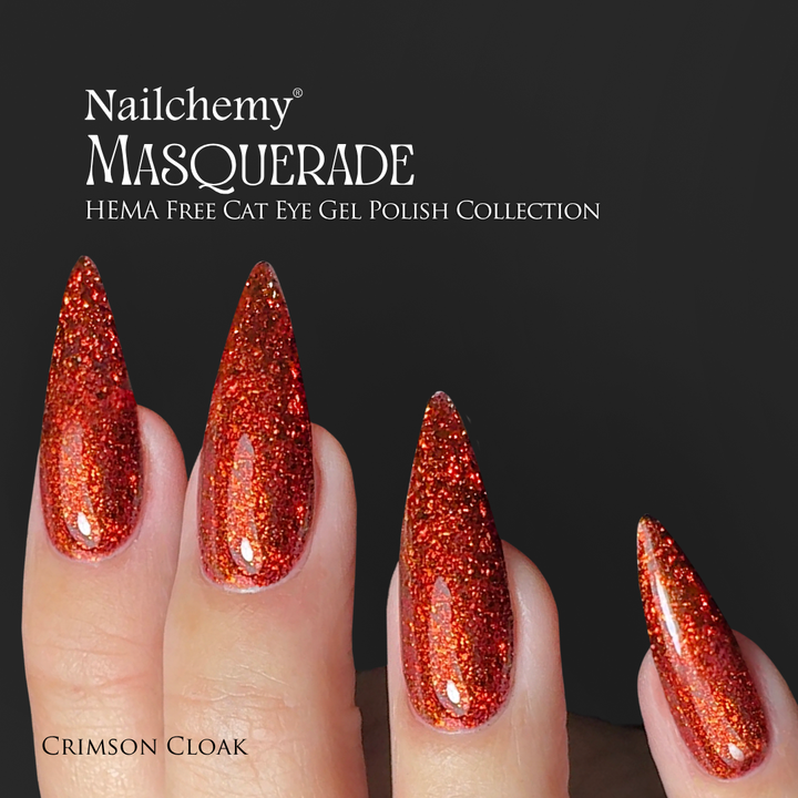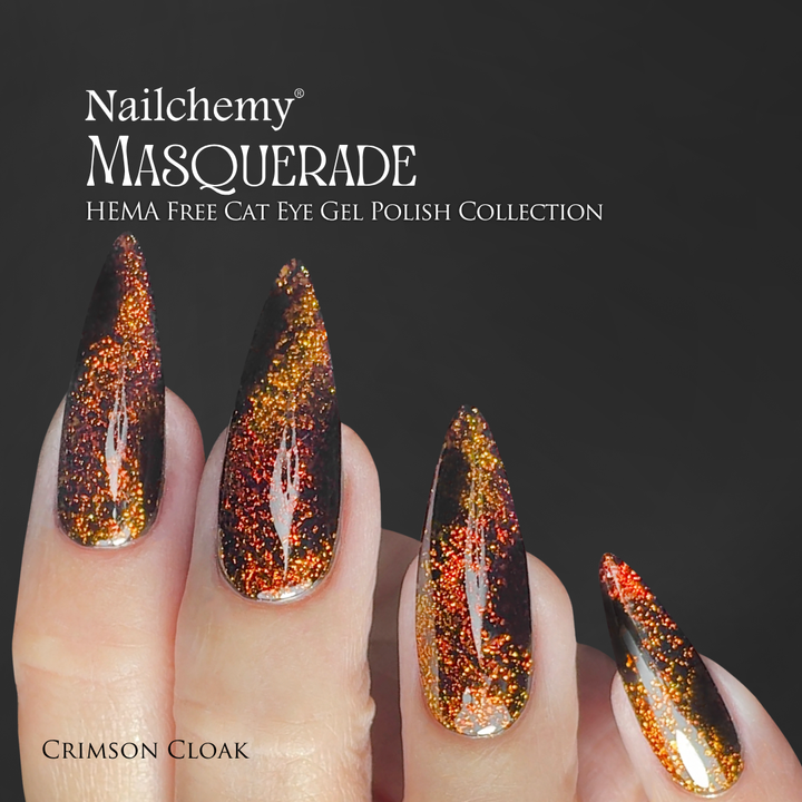 Step into the masquerade and command attention with Crimson Cloak from Nailchemy’s Masquerade Collection. This hypnotic chameleon cat eye gel polish shifts through molten tones of crimson, copper, and gold, creating a mesmerising flame-like effect that flickers with every movement. The magnetic cat eye shimmer adds stunning depth and dimension—like silk and fire intertwined beneath candlelight.