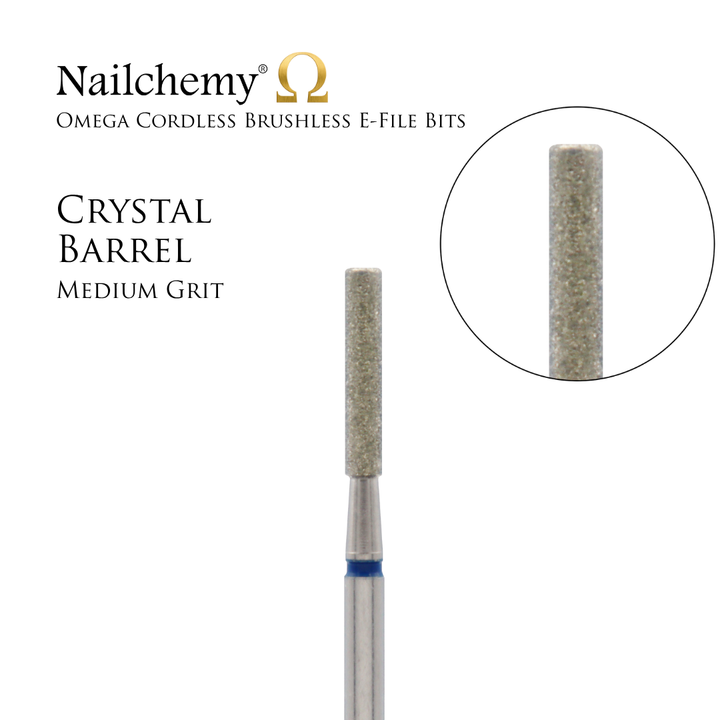 The Nailchemy Crystal Barrel – Medium (Blue Band) is a precision diamond-coated e-file bit designed for professional nail technicians. Its long, straight barrel shape offers superior control for smoothing the natural nail surface and refining overlays, while the blue band (medium grit) provides the perfect balance between efficiency and gentleness.