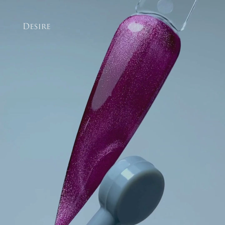 Desire is the essence of irresistible allure — a rich berry-toned red with subtle plum undertones and a velvety Cat Eye shimmer. Its magnetic pigment gives the illusion of movement and depth, creating an enchanting glow with every shift in light.