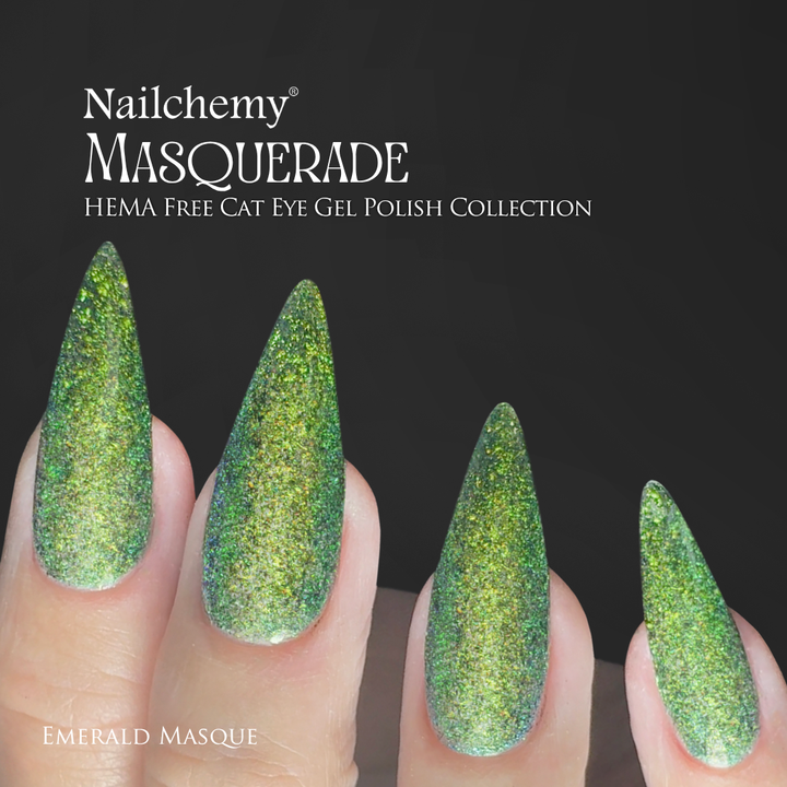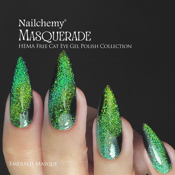 Unveil your mysterious side with Emerald Masque from Nailchemy’s Masquerade Collection. This mesmerising chameleon cat eye gel polish shifts between deep emerald, golden lime, and hints of sapphire, creating a hypnotic illusion that glimmers like a gemstone beneath the light. The magnetic cat eye effect adds luxurious depth and drama, evoking the allure of a masquerade hidden in twilight shadows.