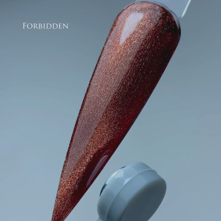 Forbidden is an intense, burnished copper-bronze shade that radiates magnetic allure. Infused with micro-metallic shimmer, this Cat Eye gel polish captures movement and light, delivering a bold, molten finish with serious impact.