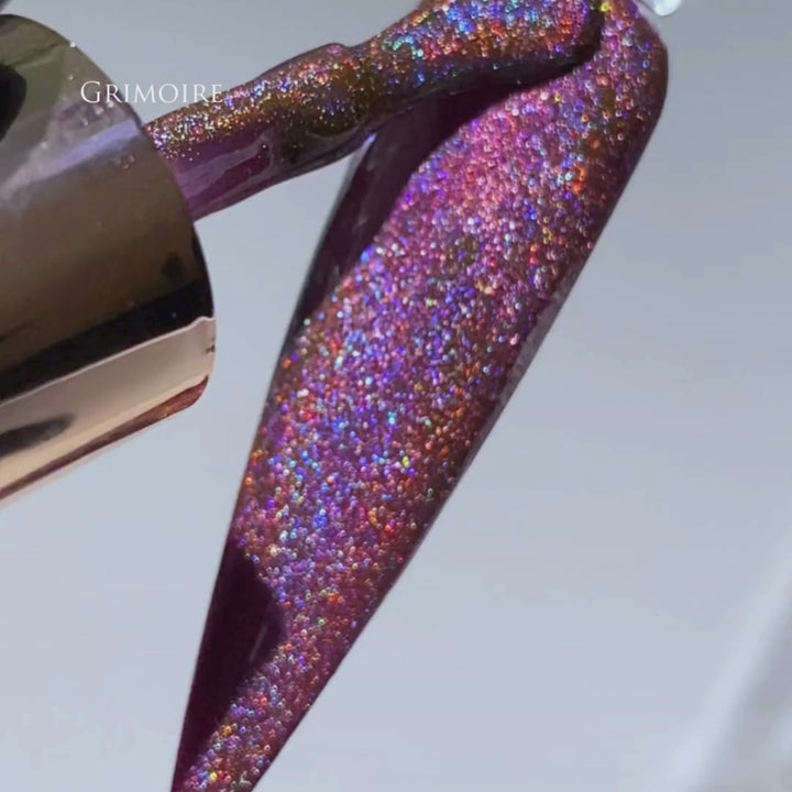 Grimoire casts a captivating enchantment with its deep berry-rose base and a dazzling holographic finish that shifts and sparkles under the light. Rich, moody, and mystical, this shade evokes the ancient power of a witch's spellbook—elegant yet full of intrigue.