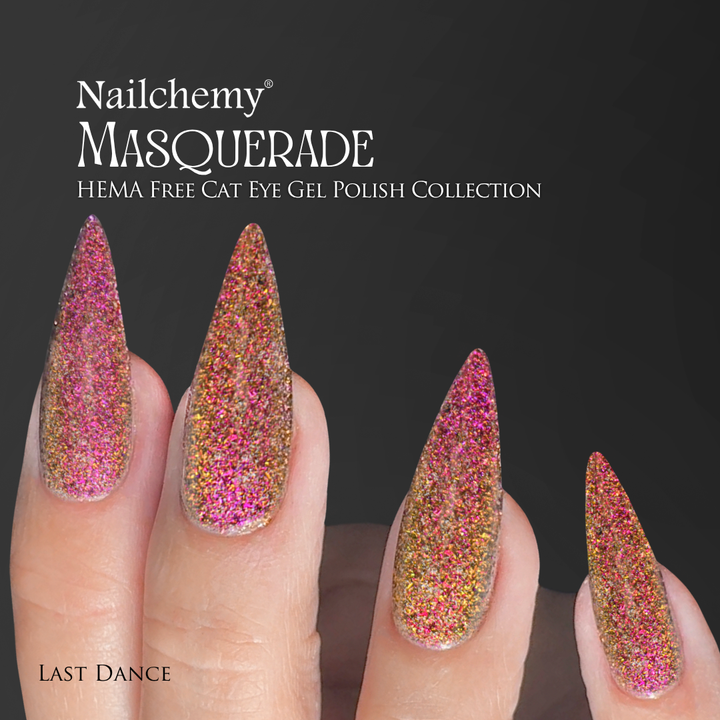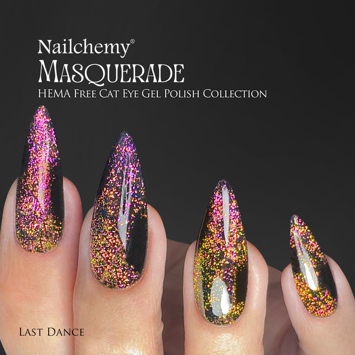Take centre stage with Last Dance from Nailchemy’s Masquerade Collection—a chameleon cat eye gel polish that captures the magical moment when the music fades and all eyes are on you. This bold, shape-shifting shade blends hot magenta, radiant gold, and hints of lime green in a mesmerising display of crushed foil flakes, made even more dramatic with a magnetic cat eye effect.