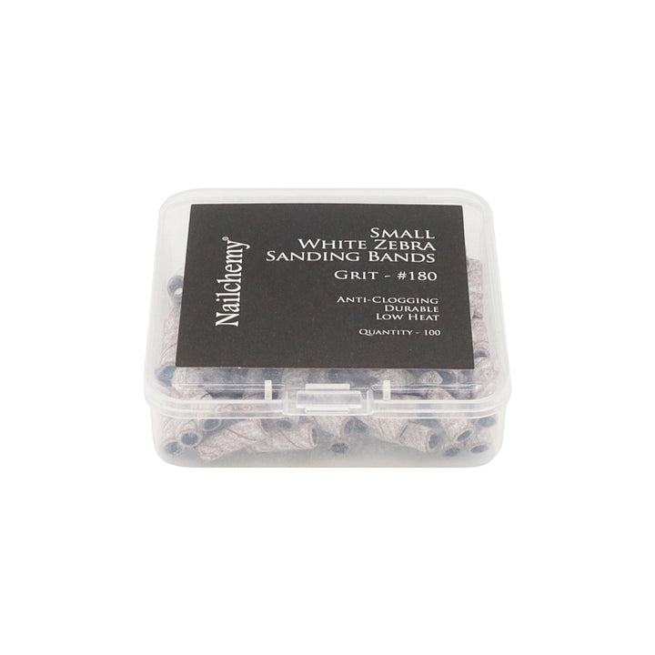 - 1 x Box Nailchemy Small White Zebra Sanding Bands – For Skinny Mandrel Bit (180 grit)
