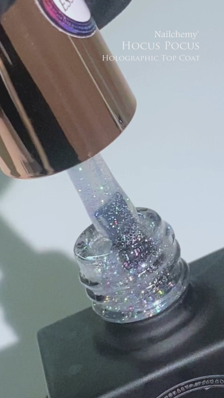 Nailchemy Hocus Pocus Holographic HEMA Free No-Wipe Top Coat is the perfect finish for your clients that love a bit of sparkle!