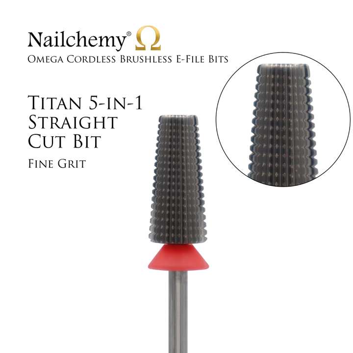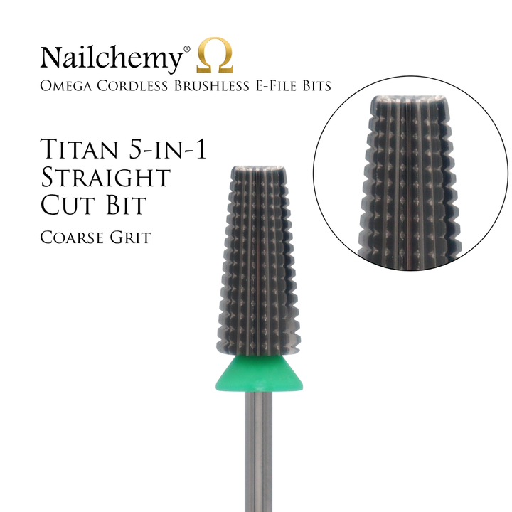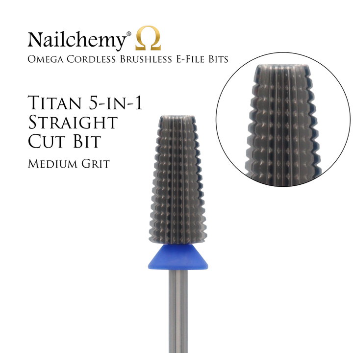 The Nailchemy Titan 5-in-1 Straight Cut E-File Bit is a professional-grade carbide bit designed to streamline salon services by offering graduated grit zones and multi-functional performance in a single tool. Each bit features: