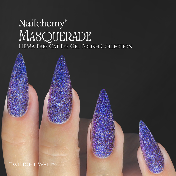 Step into a realm of mystery and moonlight with Twilight Waltz from Nailchemy’s Masquerade Collection. This enchanting chameleon cat eye gel polish evokes the graceful movement of a ballroom waltz at dusk—its base shifts between deep violet, sapphire blue, and hints of amethyst, brought to life by radiant chameleon flakes and a hypnotic magnetic shimmer.